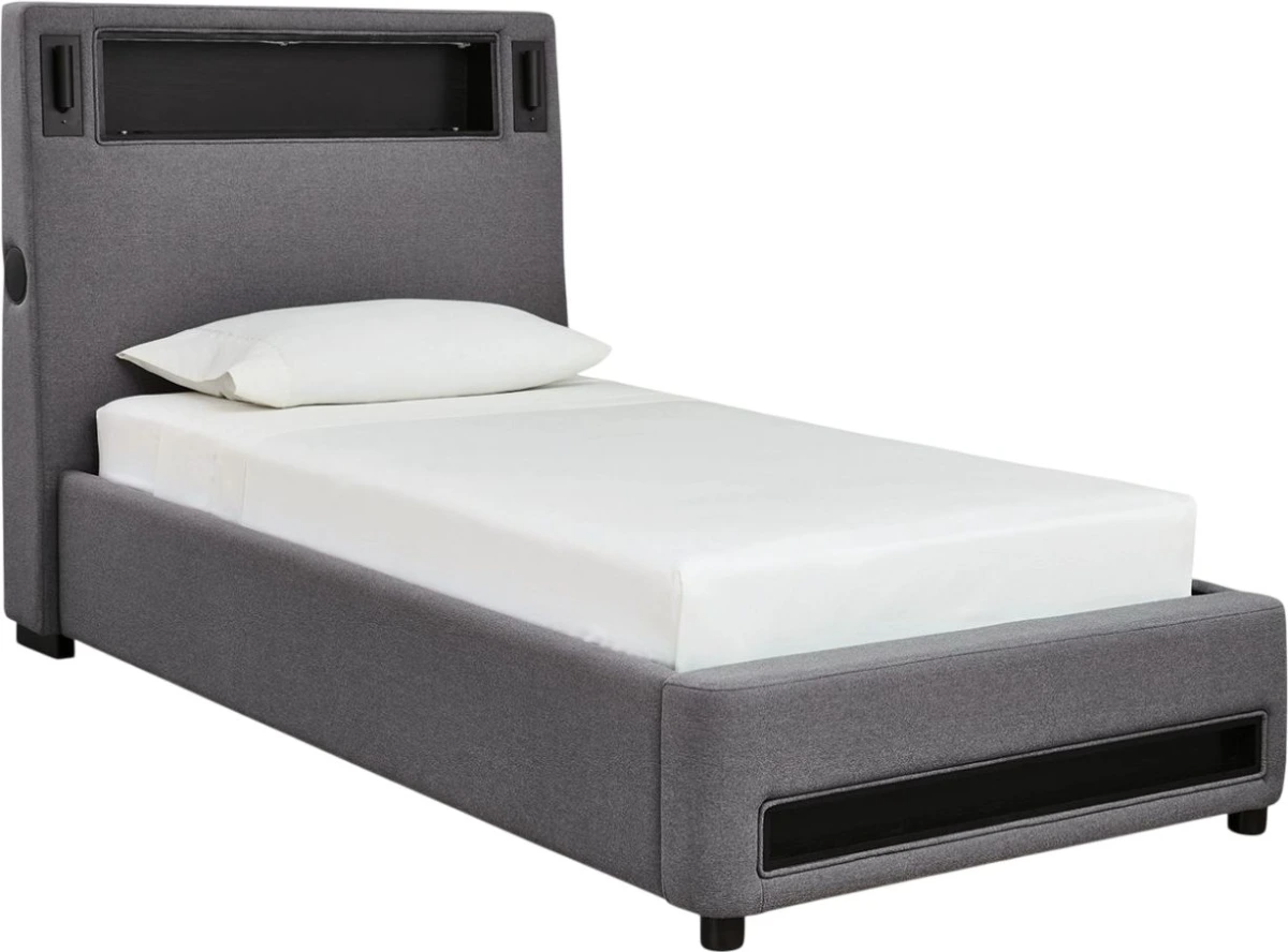 Snooze in style with this twin upholstered bed. It brings delightful function to winding down before bedtime, with an adjustable LED reading light on each side. And for added flair, multicolored ambient lighting brings an ultra-cool vibe to the overall look. Combining modern convenience with captivating design, this bed revamps your restful retreat like never before.Read More