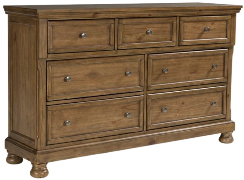A relaxed take on casual traditional design, this dresser strikes a comfy pose with a classic sensibility. Its timeless design and chestnut brown wood tone create a welcoming retreat tailored to your laid-back lifestyle. Metal knobs in an aged pewter color subtly dress up drawers packed with storage possibilities.Read More